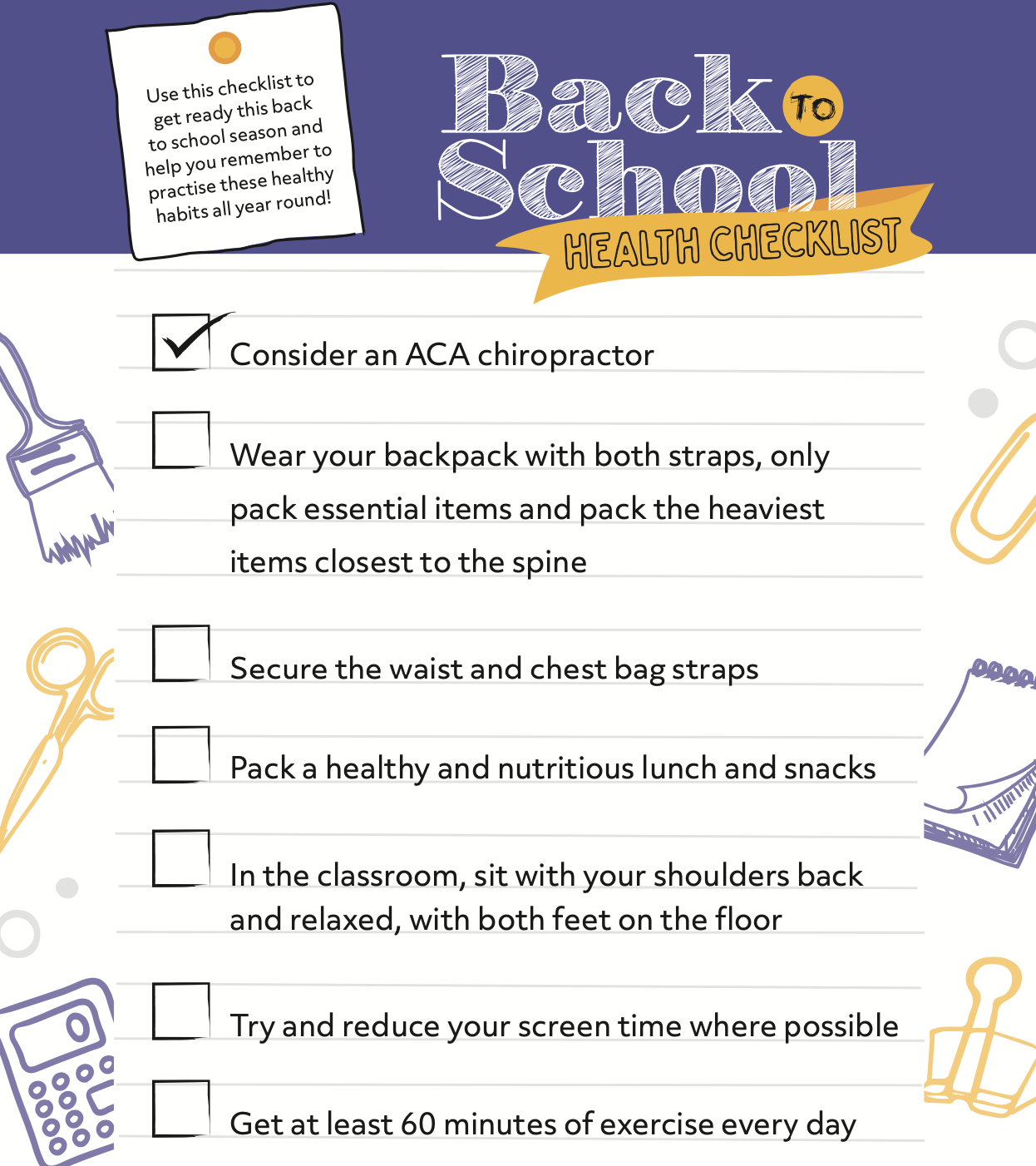 The Health Checklist also reminds kids to reduce their recreational screen time, sit correctly in the classroom and consider chiropractic care.